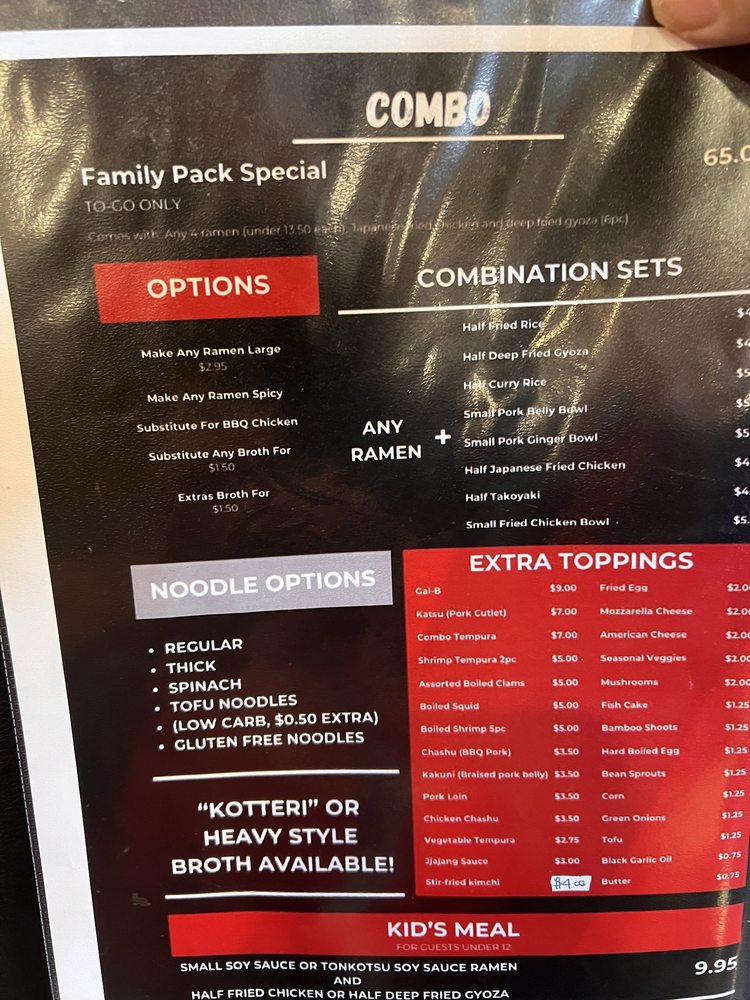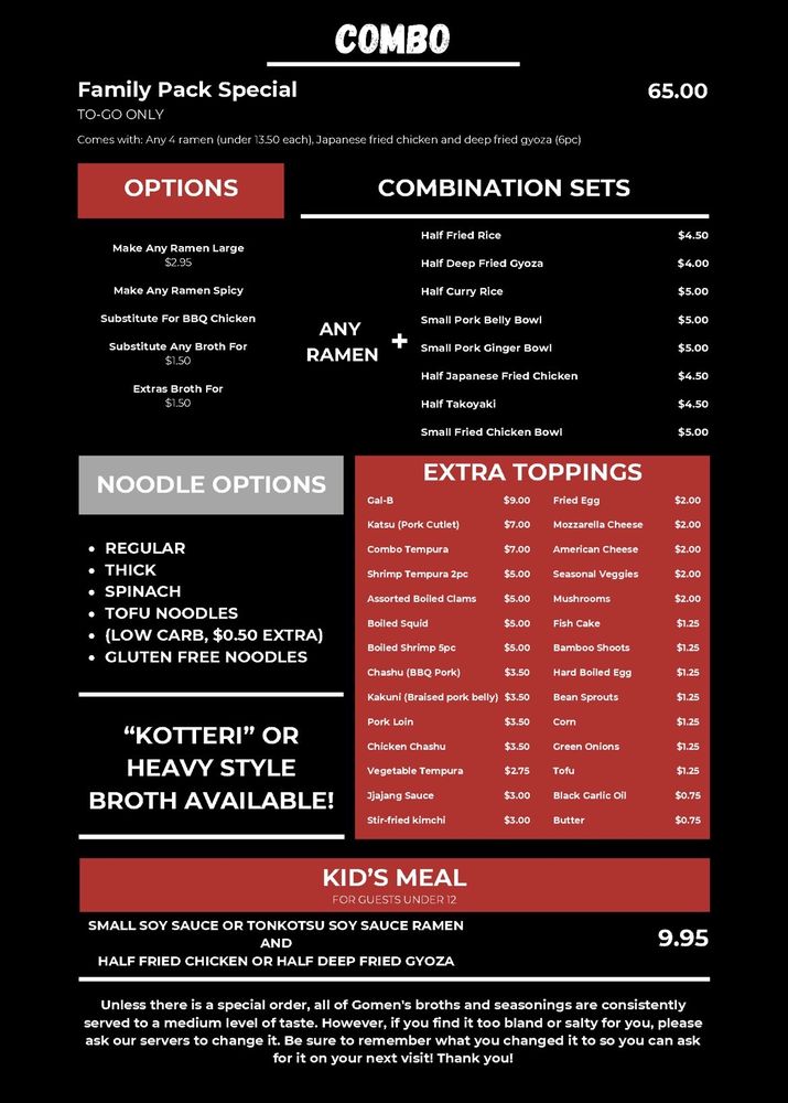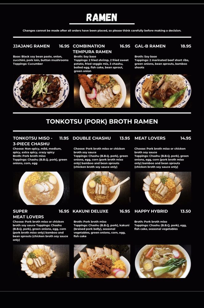 Gomen, located in Stanton, CA, is a hidden gem offering authentic and flavorful ramen options. With a cozy ambiance and welcoming staff, this Asian-owned restaurant stands out for its diverse menu. From the GalB Ramen with marinated beef short ribs to the Tonkotsu Miso Chashu with BBQ pork, Gomen ensures a satisfying dining experience. Customers rave about the quality of the soup base and the variety of toppings available. The Jjajang Ramen, a black soybean paste with pork loin and vegetables, is a must-try according to reviews. Additionally, the Kakuni Deluxe Ramen, featuring a blend of meats in pork broth miso, receives high praise. With options for soy-free, vegan, and limited vegetarian diets, Gomen caters to a range of preferences. Overall, Gomen impresses with its consistency, excellent service, and delectable dishes, making it a top choice for ramen enthusiasts.